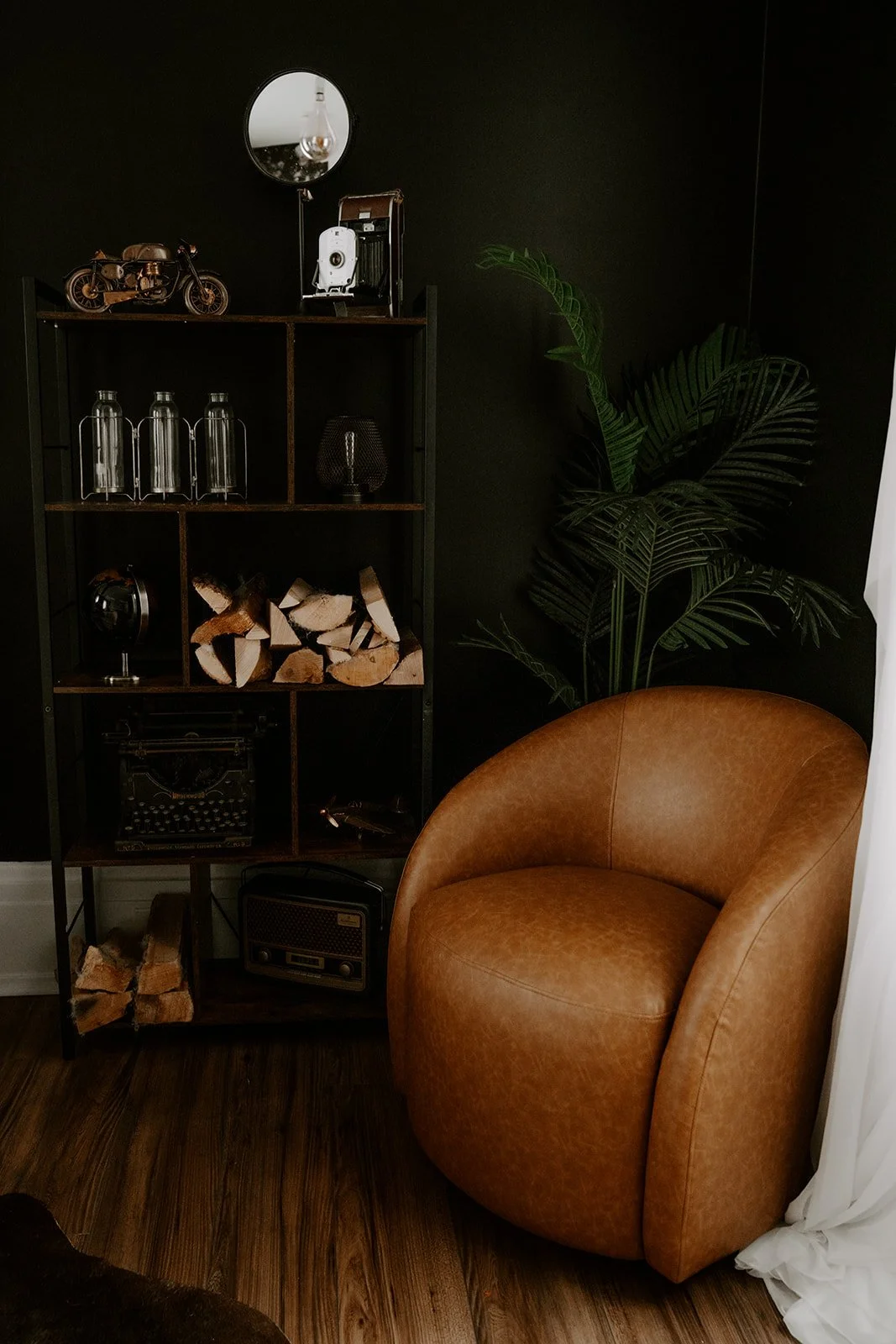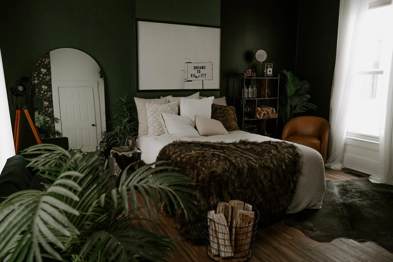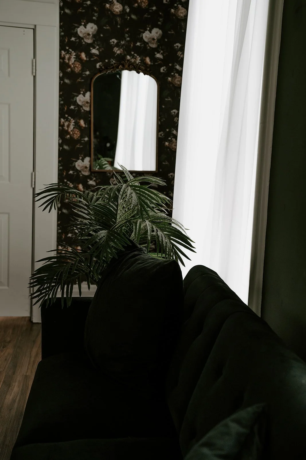 Located on the first floor of our studio building, the Iris Room is a dark and moody space that exudes academia vibes intertwined with vintage touches and florals. This captivating room is adorned with an antique typewriter, dried floral arrangements, and beautiful floral wallpaper, emanating a sense of classic elegance. The color scheme includes dark alpine trail green and black, complemented by a large ornate gold mirror that adds a touch of luxury. The room features a distinctive bed as the focal point, creating a cozy and intimate atmosphere. Additionally, the Iris Room is equipped with a state-of-the-art seamless backdrop system offering four colors of seamless paper, providing endless possibilities for creative photography sessions.