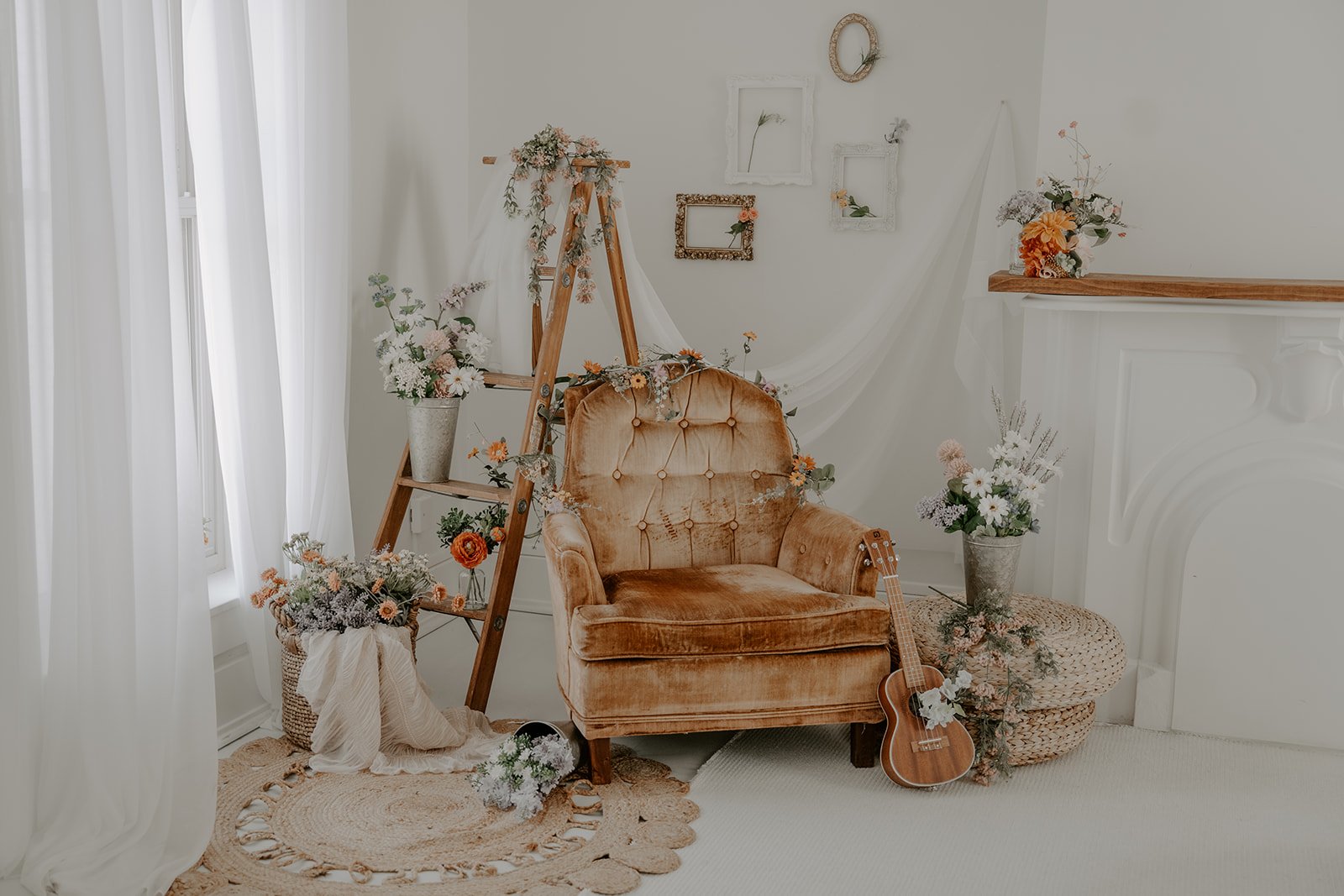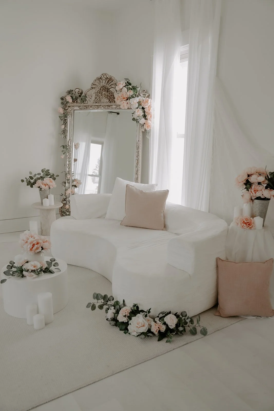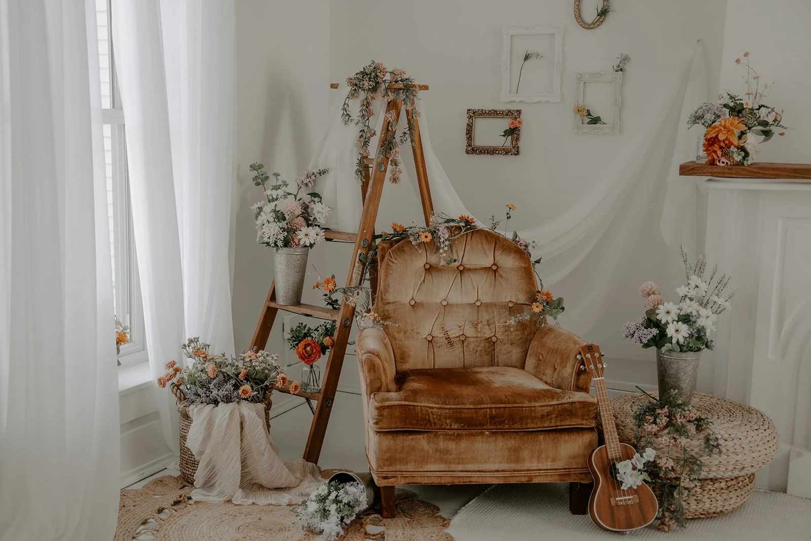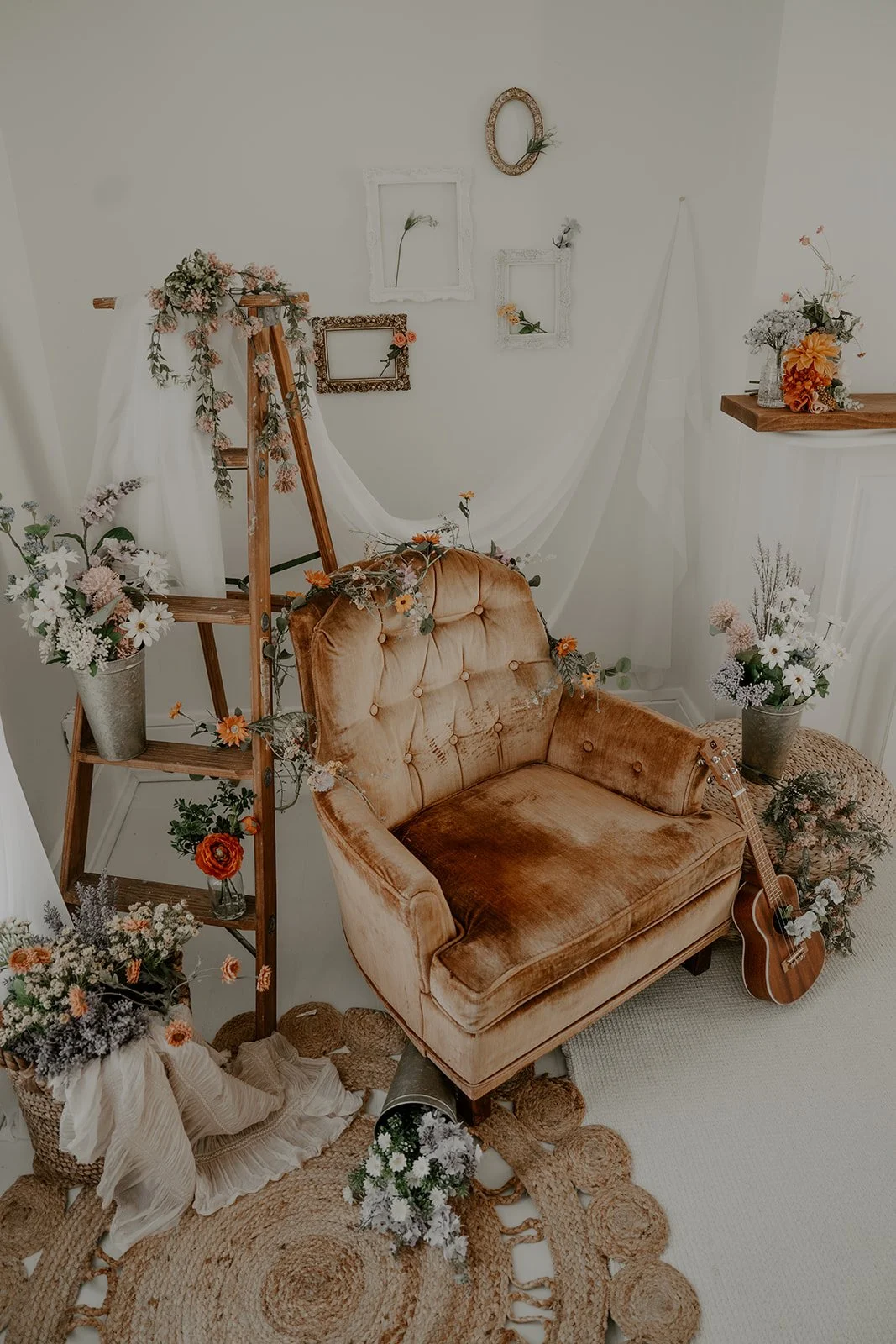 This season features three distinct looks in one beautifully styled space. One side of the studio is soft and classic — an ivory curved sofa, blush florals, flowing drapery, and a vintage mirror wrapped in blooms for timeless, romantic images. The opposite side brings warmth and whimsy with a caramel velvet chair, layered textures, woven rugs, and organic florals for a cozy, storybook feel.