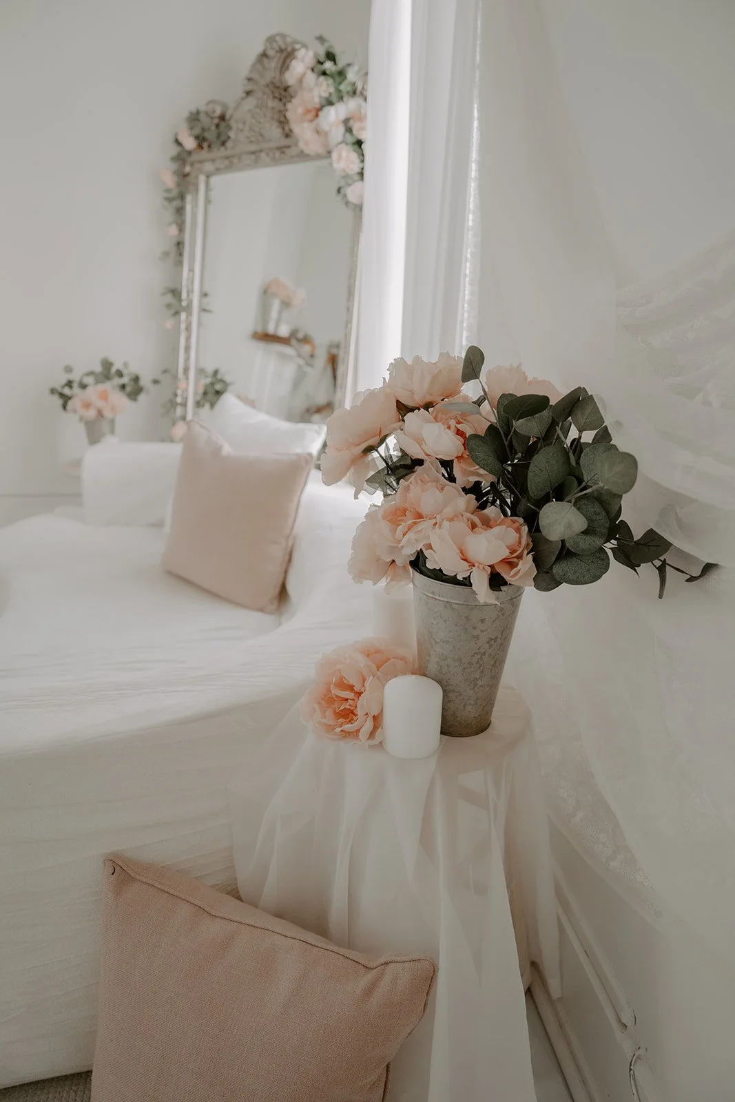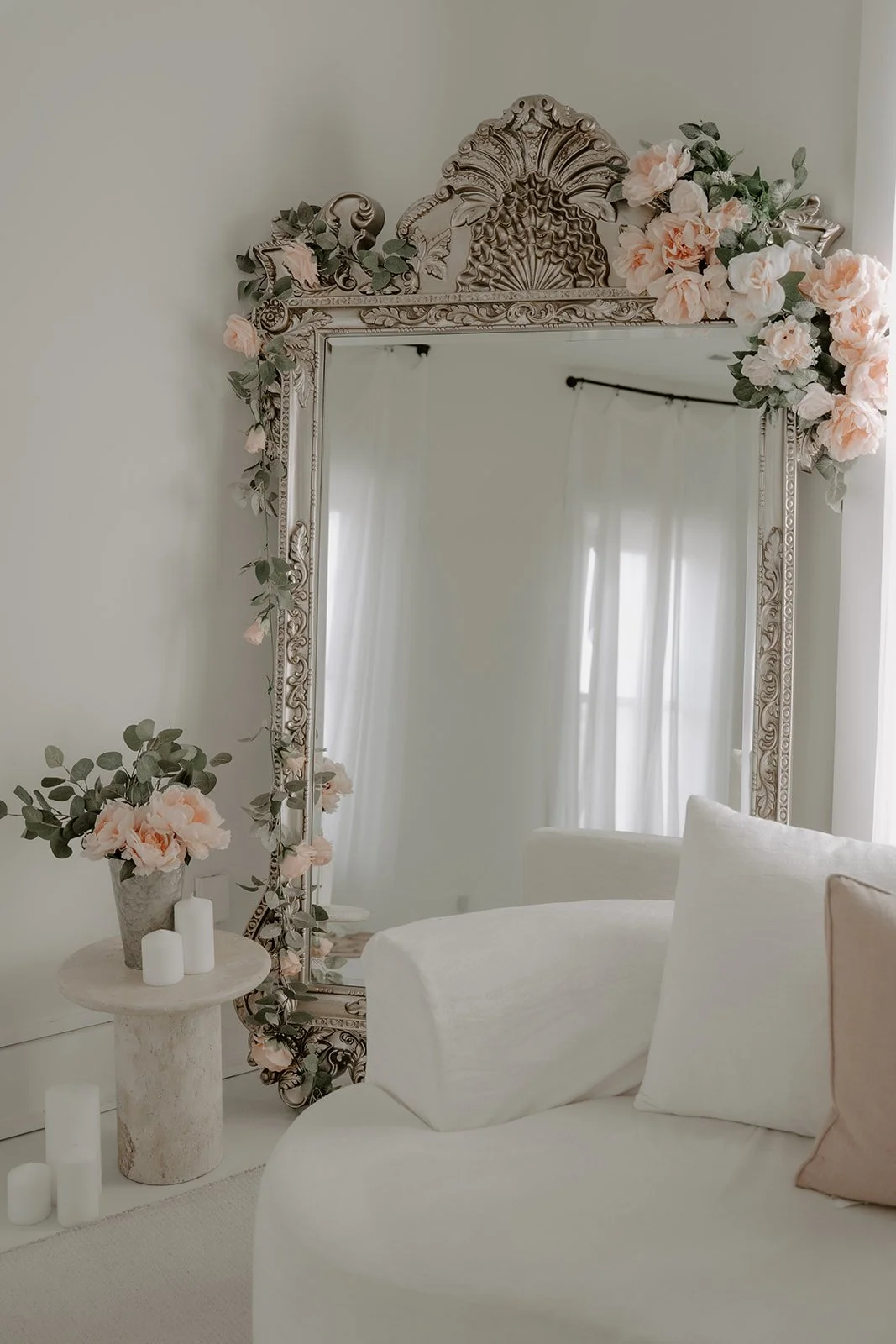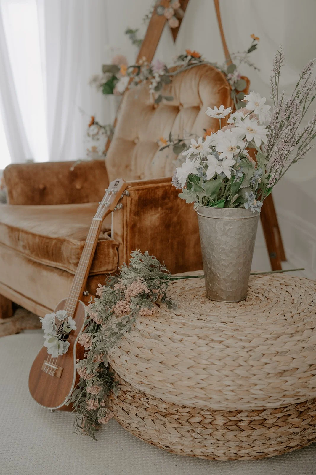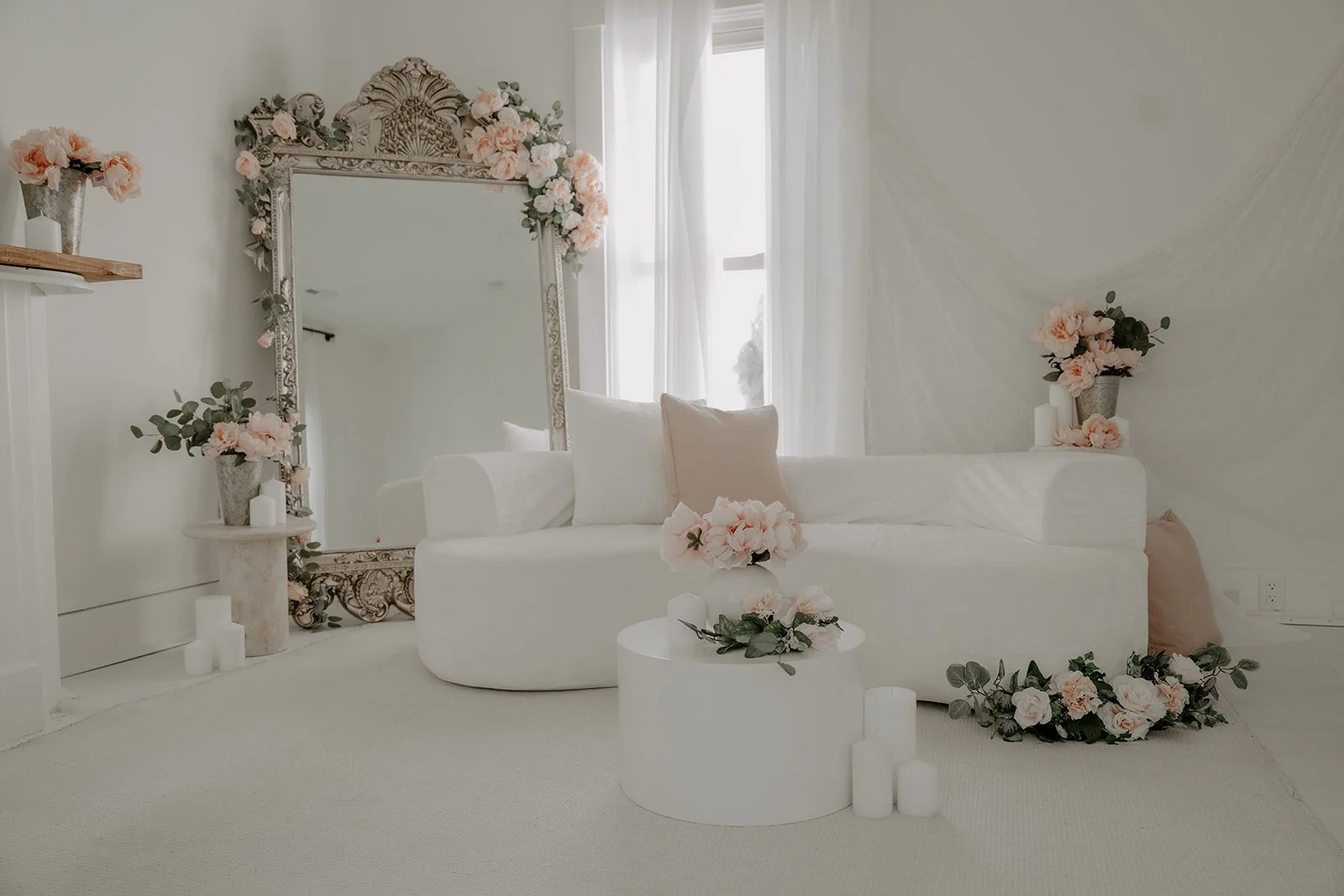 This season features three distinct looks in one beautifully styled space. One side of the studio is soft and classic — an ivory curved sofa, blush florals, flowing drapery, and a vintage mirror wrapped in blooms for timeless, romantic images. The opposite side brings warmth and whimsy with a caramel velvet chair, layered textures, woven rugs, and organic florals for a cozy, storybook feel.