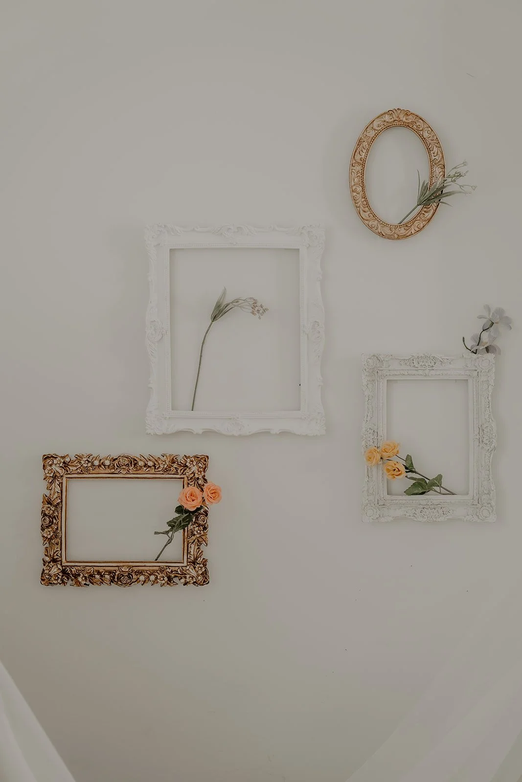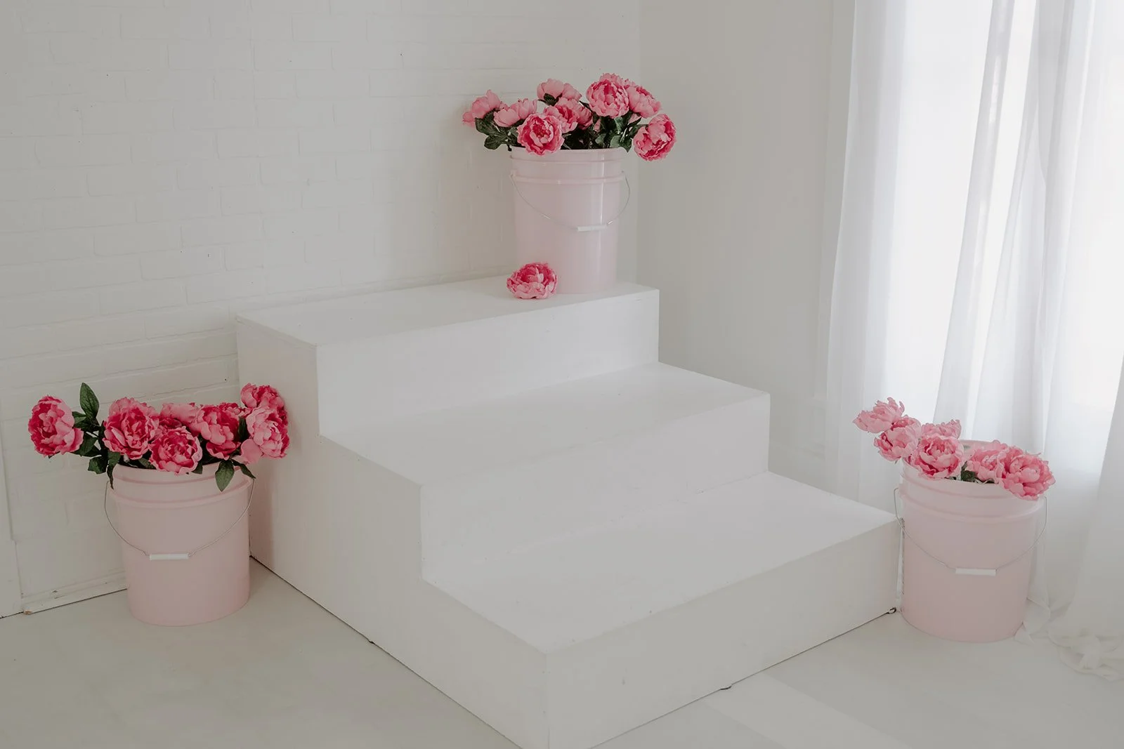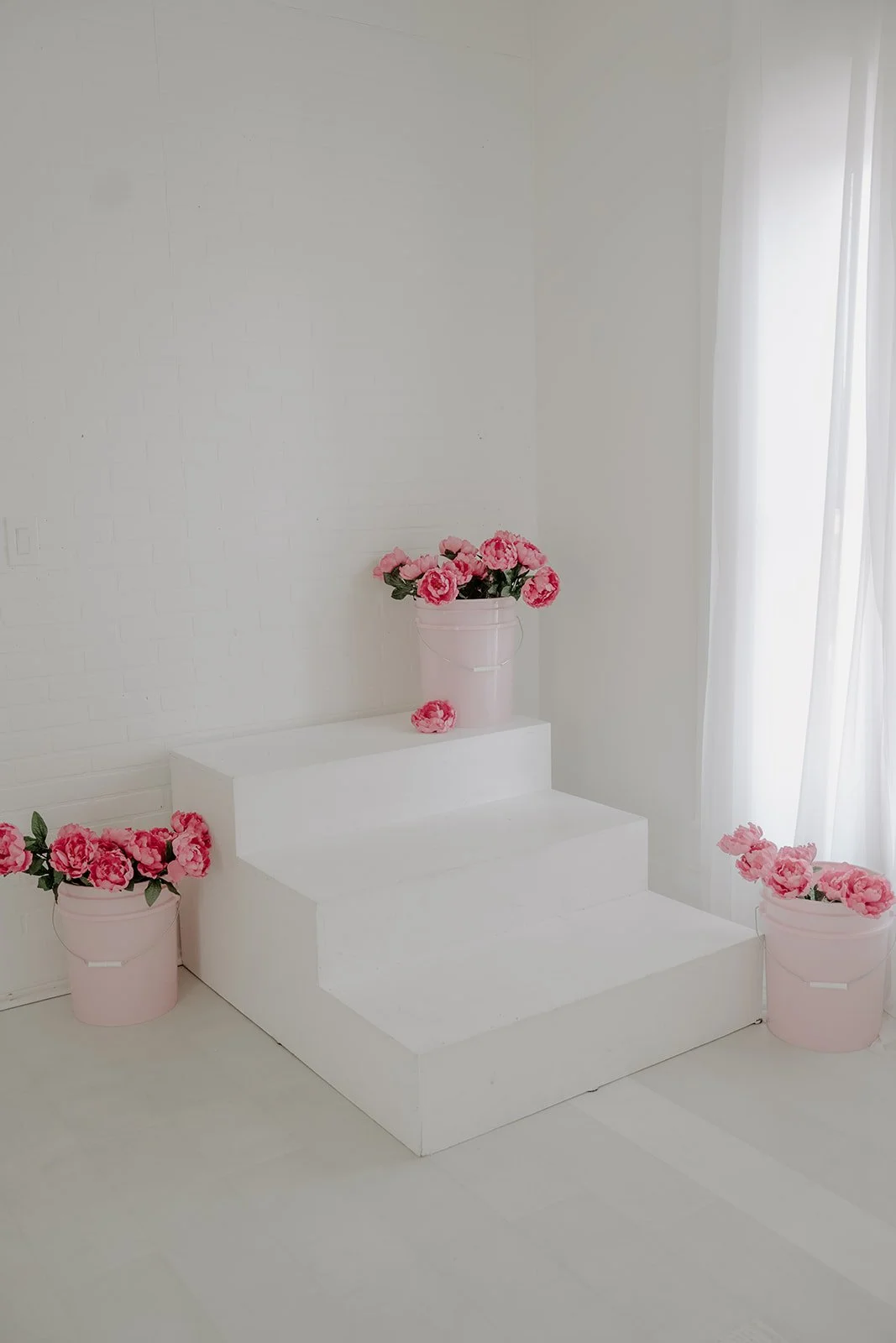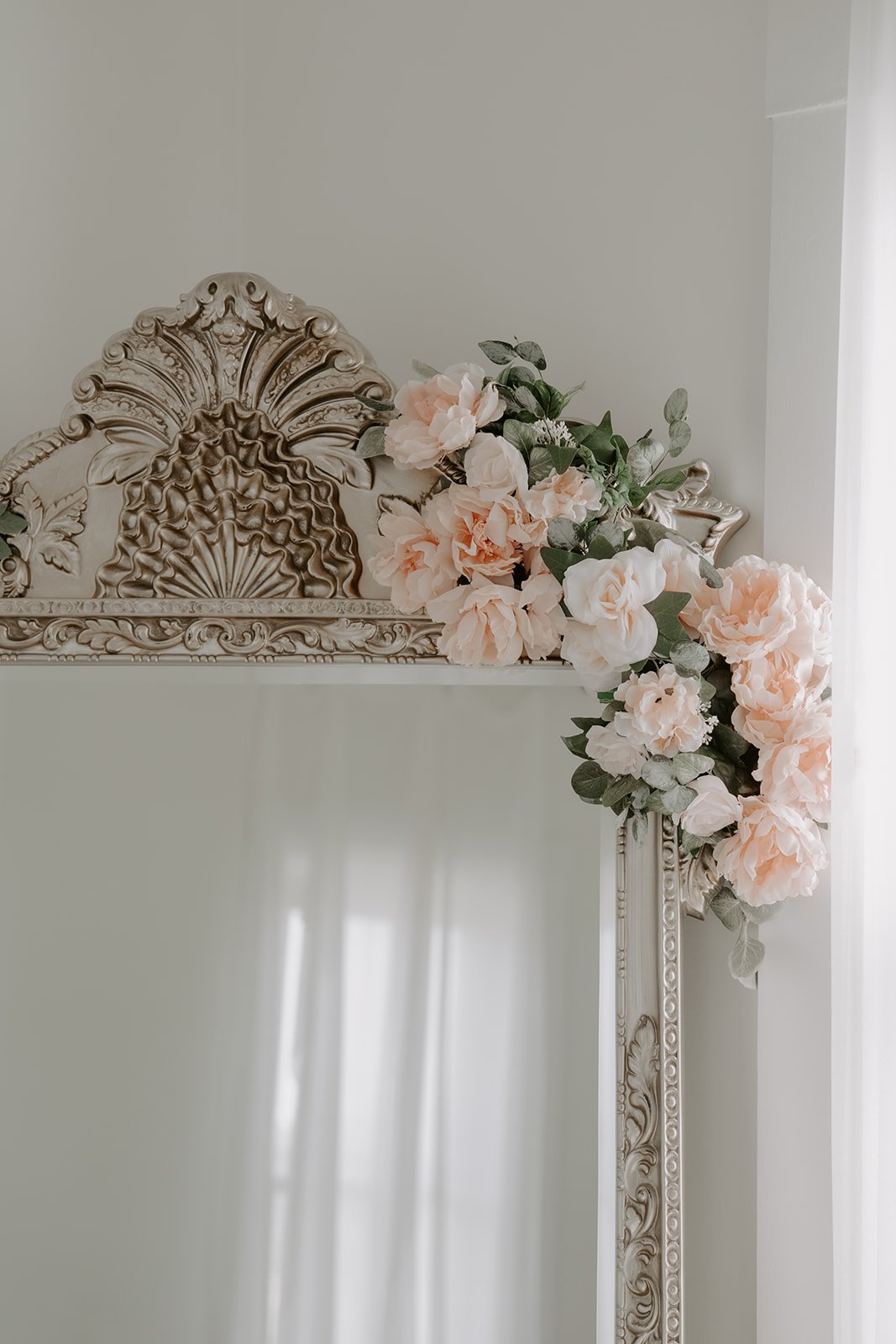 This season features three distinct looks in one beautifully styled space. One side of the studio is soft and classic — an ivory curved sofa, blush florals, flowing drapery, and a vintage mirror wrapped in blooms for timeless, romantic images. The opposite side brings warmth and whimsy with a caramel velvet chair, layered textures, woven rugs, and organic florals for a cozy, storybook feel.