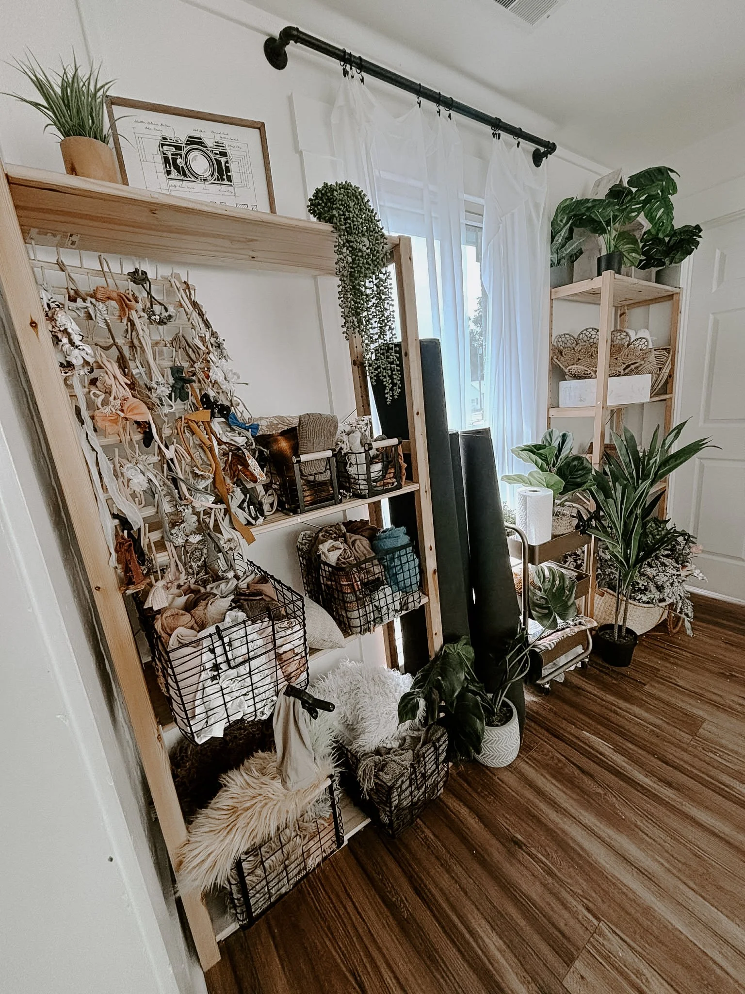 The Flora Suite is our newest addition on the second floor, designed for newborns. The first room boasts a cottage core-inspired bedroom adorned with hanging babies breath and a canopy bed, creating a serene setting. Transitioning into the second room, photographers will find our built-in light panel room, which simplifies lighting for newborn shoots by providing a natural glow. The suite comes fully equipped with an array of newborn props, swaddles, layers, and headbands to ensure a seamless and picturesque photography experience.